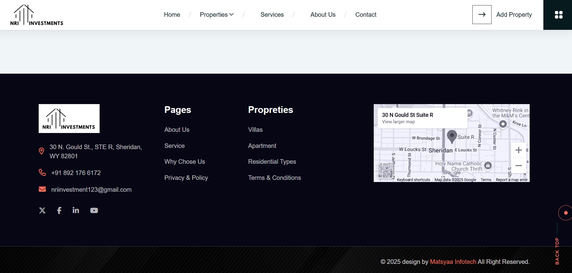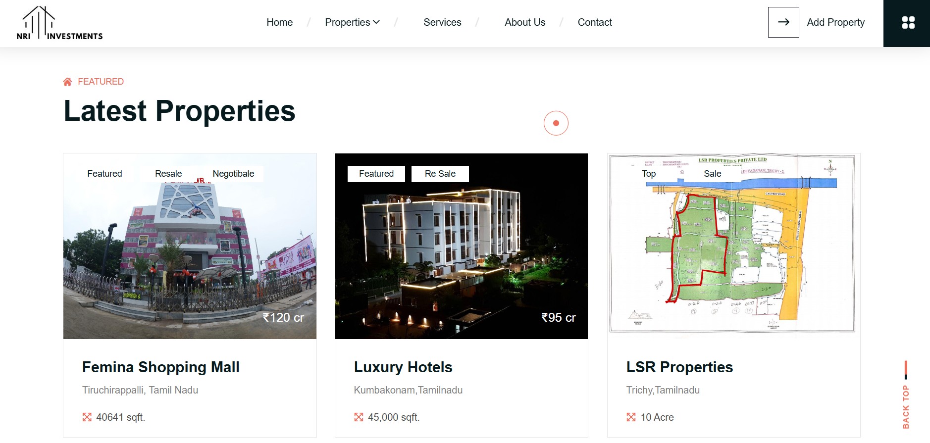 The NRI Investment platform was developed by KMo Infotech to serve Non-Resident Indians (NRIs) looking to invest in premium properties across India. The website is a responsive, user-friendly platform offering curated listings, legal guidance, and investment insights tailored for NRIs.